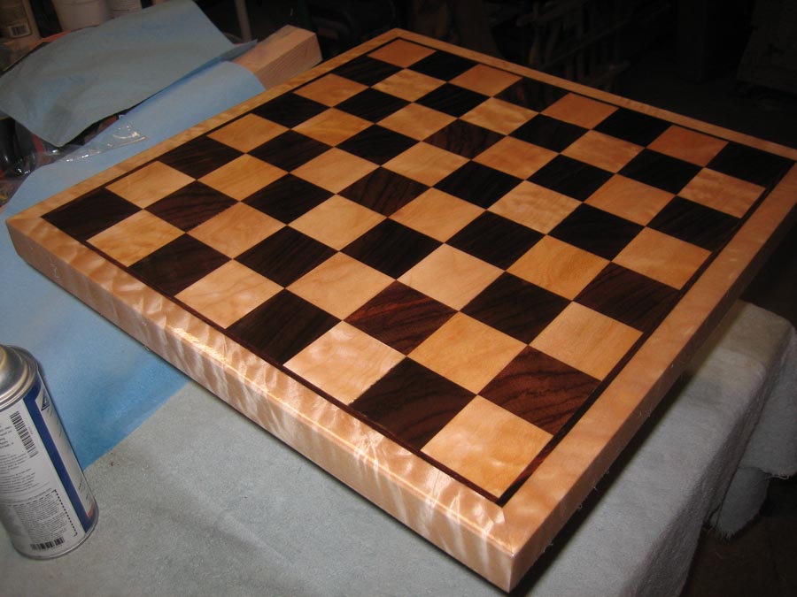 First Chess Board attempt – Quilted Maple, Cocobola and East Indian Rosewood. Very fun project to make. Now for the Pieces!