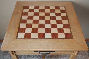 Chess table for my son at Christmas. Quarter sawn white oak, with maple and bubinga squares.