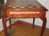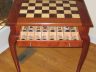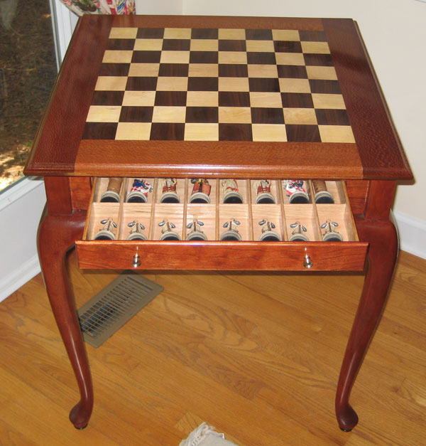 I enjoy making chess tables, and I think this one turned out pretty good. The field is walnut and maple, the frame is leopardwood, and the base is cherry.