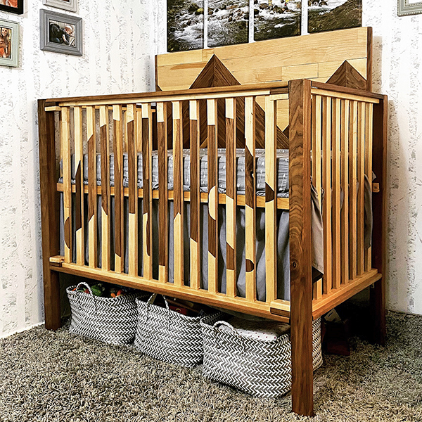 “This wilderness-themed crib was a personal passion project. Both parents love the outdoors, so the backing piece showcases a mountain range made with maple, walnut and reclaimed barn wood. Silver accents fill small pinholes throughout, sparkling in the light. Being in California, as well as a UCLA alum, a bear silhouette is the centerpiece of the crib, made using maple and walnut. All effects were made practically with wood – no stain or paint used. The crib as shown measures 66” long, 46” deep and 66” tall when fully assembled, with storage space underneath for toys and blankets. The crib comes apart for both ease of assembly and storage, as well as allowing the front piece to be removed to convert into a toddler’s bed.” – Alex