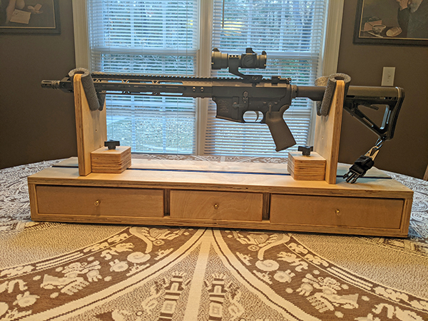 “Here’s a gun stand/vise I made. The drawer pulls are 9mm shell casings.” – Stephen Athans