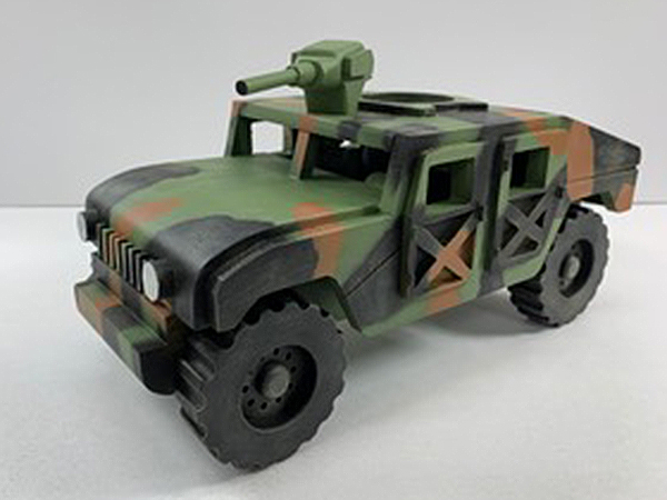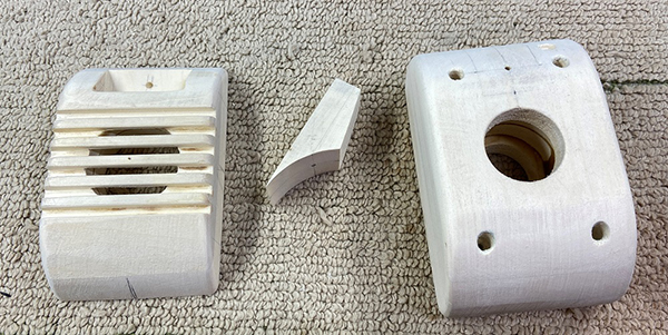 “I fashioned this Bluetooth speaker kit from Rockler into the shape of a drive-in theater speaker. It’s all basswood. There is some metallic speaker grill cloth on the inside, a knob-less volume switch, some wires hanging out the back and a metal plate to hang it. It’s finished with acrylic paints and flat lacquer spray.” – William Aulick