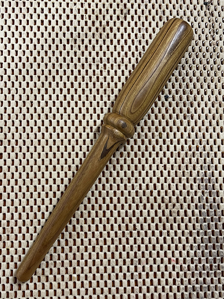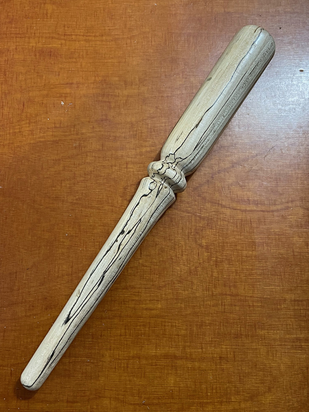 “My daughter is an avid knitter. I have made several knitting accessories over the years. This year she wanted to go old-style. She wanted a nostepenne, which is a peg to wind a ball of yarn on so the yarn can be pulled out of the center after it is removed. She especially wanted spalted maple. I also made one out of redbud.” – Robert Beran