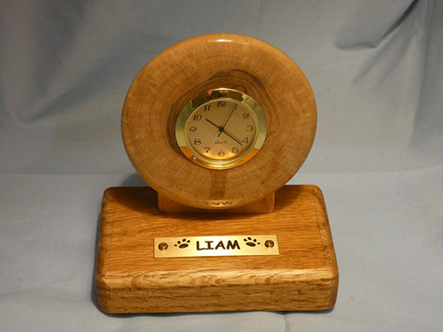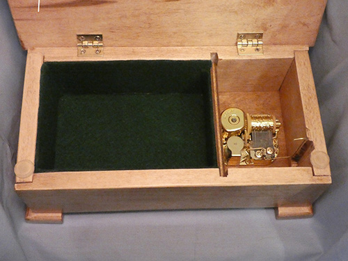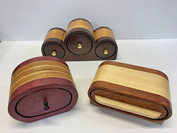 “The clock is set in a birch donut with a CA finish. The base is oak. It is for a grandson. The musical jewelry box is made from stained maple and plays the Blue Danube. It is for my granddaughter.” – James Brink