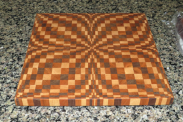 “My optical illusion end-grain cutting board is made of cherry, maple and walnut. It measures 1-1/4″ x 15″ x 15″.” – Herb Brodie