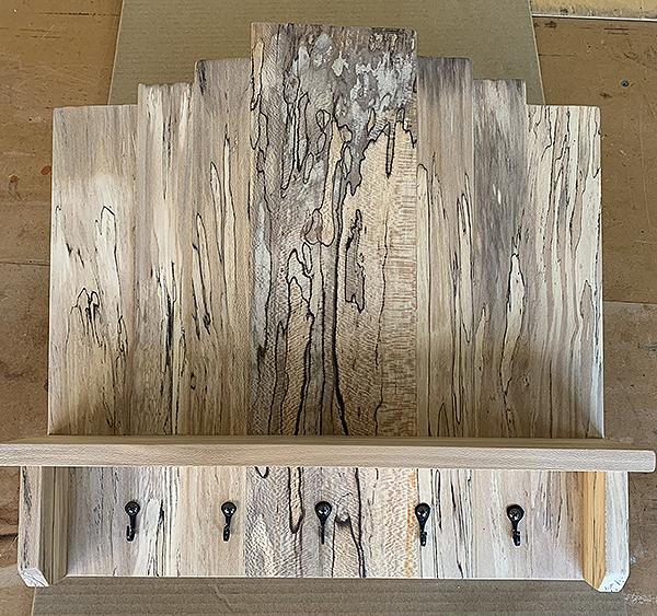 “Here’s a coat rack I made from spalted sycamore. I was inspired by the false front architecture of the old west. I used hand forged nails for the hooks. It measures roughly 4” x 19” x 19”.” – Peter Hill