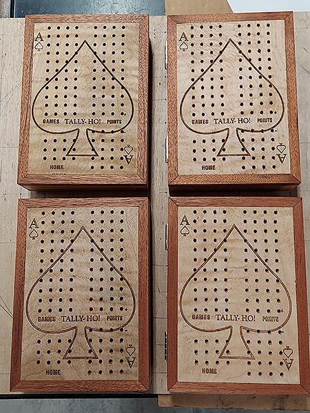 “My adult son asked me to make some game boards for Christmas gifts for his friends. These are similar to a cribbage board but for a card game called Pitch. We decided on a box with a hinged lid in which the cards and pegs could be stored. I had the tops laser-etched with an image of the ace of spades. The holes were drilled using Rockler’s cribbage board template. However, the pegs I bought are slightly larger than standard cribbage pegs, so I had to use the “Games” section of the template, which has a slightly bigger hole spacing.” – Don Lamothe