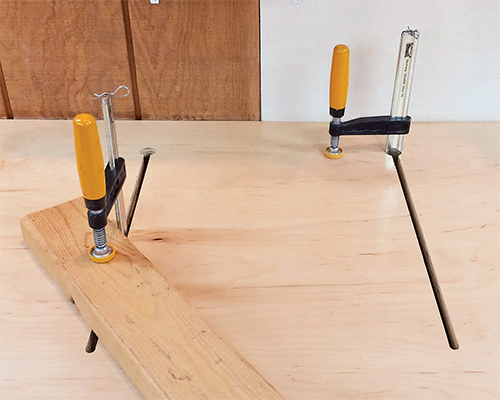 I don’t have room in my small shop for a workbench with bench dogs. Instead, I routed a pair of straight slots in my shop countertop, wide enough to fit the bars of two “F” style clamps. I dismantled the clamps and slid their bars up through the slots, then reattached the adjustable clamp heads back on the bars with cotter pins. I can slide these clamps forward or backward where they’re needed, for convenient clamping.