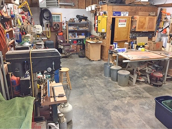 “I’m 20 miles north of Grand Rapids, Michigan, on the east side of a lake. Yup, cold winter winds pouring out of the west, across a frozen lake, chilling my work space. For years, my 24′ x 30′ garage with a large attic was not heated because it wasn’t insulated. But a year ago, we installed wrap-on and vinyl siding. We wired it up for better lighting and plug-ins, then insulated the ceiling and walls and put up drywall. All the work was done by my son and me. We have natural gas at the house, but it’s 100 ft. away down a hill, and between it and the garage is a septic and drain field. To tap into the main line running from the road would have required putting a separate meter on the garage, and I wasn’t quite ready for that. I had a used propane downflow forced-air wall heater with two 20 lb. and two 30 lb. tanks with an auto switching valve, so I installed it, built a sealed box in the corner of the garage and vented it to the outside for the tanks to fit in. I only keep the garage at about 50 to 55 degrees to keep the chill off when it starts to get cold, and that costs about $100 per month. I find that I work well in that temp, and keeping the concrete floor warm helps a lot. I have thought of going to a more efficient furnace, but where do you stop? Not sure what it would cost to have the local utility company trench in a new line and install a meter for me, and I have not priced a new updated furnace. I know it would reduce my monthly cost, probably even give me an additional 10 degrees for free, as well as pay for itself. But at 72, I just don’t know. I’m not yet a major woodworker, but I did buy a lot of woodworking toys before retiring after 40 years in tool and die. Since updating the garage, I started building sound-proof drum rooms for churches so they can control the loudness of the drums through a sound board to match the other musicians. That way, grandma in the front row isn’t having her ears blown out, should the drummer get excited. I’ve built three so far and I find it challenge and rewarding.” – Mike Dennis