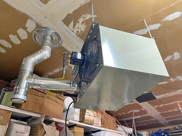 “To heat my 32′ x 26′ shop, I purchased a used heater sourced on the local Craigslist. Not having natural gas to the shop, I looked for an LP heater. Once the heater was sourced and installed, I contacted a local LP supplier and arranged to have two large LP tanks installed and the piping run to the heater. With the thermostat set at 40 degrees, there is no concern about items in the shop freezing. The heater can bring the temperature in the shop from 40 to 70 degrees in about 15 minutes. In the photo above, my heater can be seen in the upper left corner. It is suspended from the building trusses and exhausts through the end wall of the building.” – C. Ronald Farver