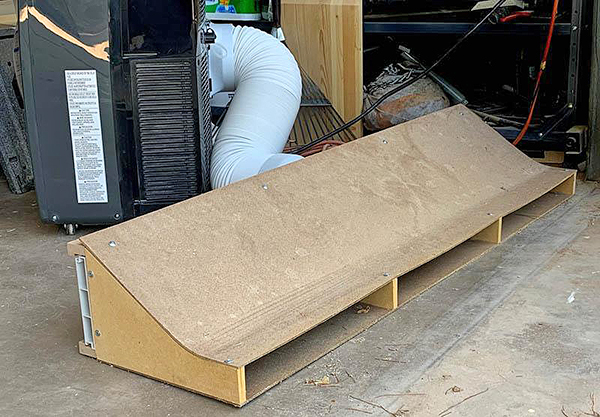 “We live in the Sonora desert of Arizona where temperatures inside the workshop range from 60 degrees in the winter to 100 degrees in the summer. The attic is insulated, I have 1-1/2”-thick foam on the garage door and one and a half walls are common to the living area. The remaining walls are block construction. During the pandemic, I found myself spending more time woodworking, so I had to bite the bullet and buy 14,000 BTU portable A/C unit. The instructions say you cannot run the hot exchange air up through the ceiling, so I built a vent that routes it under the garage door (see above photo). I simply open the garage door slightly, place it under the door, release the opener and ease the door on top of this with some boards blocking the rest of the gap. Then I place swimming pool noodles in the gap across the top of the door. When the outdoor temperatures are around 100, I use this setup and a fan blowing from the house through the walk-in door. When outdoor temperatures get to around 110, as it did often this summer, this only helps until it gets too hot to work. Then I have to quit for the day, usually around noon. Below 100, It is a good setup, keeping the shop at around 80 degrees. One problem is, when I do something that my dust collection system can’t control enough dust, I have to close all doors, turn off the A/C and make the sawdust. Otherwise too much dust gets into the house and into the portable A/C unit coils. Blowing cool air from the house is also out of the question when I use chemicals like oil-based finishes. Having a ductless system installed for the garage was a little out of my price range, so this is the best I can do for now. Heating the garage in the winter is done with a space heater of 700 to 1,500 watts, and that does the job real fine. Any time I have critical wood that can’t be exposed to constant changes in temperature and humility, the wood comes into the house for the night or until I need to work on it. If I had it to do over while I was younger, I may re-think the ductless A/C installation.” – JF Praught