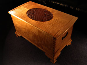 “This is a curly maple blanket chest I built. I inserted a leather panel in the lid that was made by a local saddle maker (Leah Kemner of Horseshoe Saddlery in Coeur d’Alene, Idaho) that does exquisite work. I very much enjoyed the collaborative effort.” – Derek Wolcott