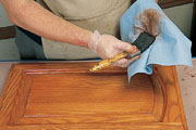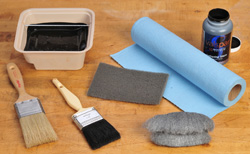 Pour some glaze into a pan and grab a blending brush, left, and an application brush, right. Use paper shop towels to wipe, and steel wool or nylon abrasive pads for grain effects and feathering.