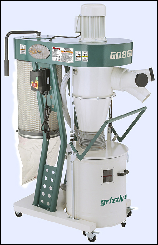Grizzly’s G0861 has a 2hp single-phase motor that operates on 220-volts. It develops 1,023 CFM (10.9-in. of maximum static pressure in a water column), and you can connect up to three 4-in. hoses to the adapter on its 6-in. inlet.