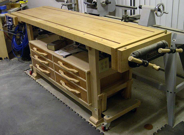 “For the better part of my woodworking ‘life’ I worked out of a tiny shed in the backyard of my parents’ house and had no workbench at all. I literally used the table top of my radial arm saw as my ‘bench’ (which I had to drag out of the shed to work on anything longer than 3-1/2 ft. in length). When I finally bought my own home and I got married, my wife agreed that she got the entire house and I got the two-car garage — a deal that I still think was in my favor. At that time I built a rugged but cheap bench out of 2×4 materials and plywood. No woodworking vise, just a machinist’s vise inherited from my father. Later I bought the DVD/plan set for built-in cabinets/bench from the ‘The New Yankee Workshop’ and completed the project in a week. Finally covering an entire wall of that garage I had a place for all of my tools and a work surface to boot. But still no true ‘work bench.’ Like you Rob, I usually use power tools for convenience, but I long to finally truly build something with my hands. Several years ago my sister had a maple in her yard die and had it taken down. She donated the logs to me and I had them milled into thick lumber. It has been air drying ever since. It is stickered and stacked in my garage, and the plans for a classic workbench sit on top of it. I have now officially moved the idea of a new workbench from the ‘one-day’ dream stage to ‘this Fall’ plan stage. With a little luck, and a lot of work, I will be giving myself a workbench for Christmas this year.” – Joe Johnson, Colorado