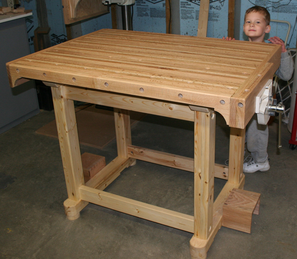 “I’m with you, Rob: benches should be stout and solid. But, my budget was weak and subdued. My answer: standard 2x4s laminated side by side, planed and sanded, supported by a 4×4 framed and tray shelf. Twenty-five years later it still serves me well. I sanded it down once and finished with a good urethane. It may not be maple, but I’m not royalty either.” – Arlan Quandahl