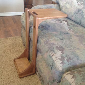 Not everyone has the room for end tables next to the sofa. My wife asked for a table she could use that didn’t block off the living room entry. Our sofa sits tight to the floor all around so I made a table with a counterweight to keep it stable. (Photo 1) The counterweight is the small box at the bottom loaded with 16 pounds of lead shot. The material was knotty alder.