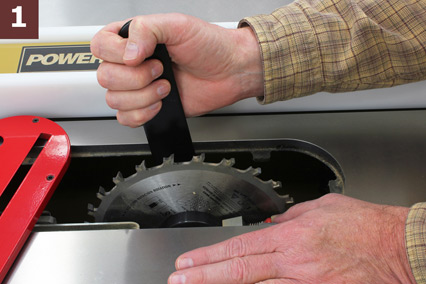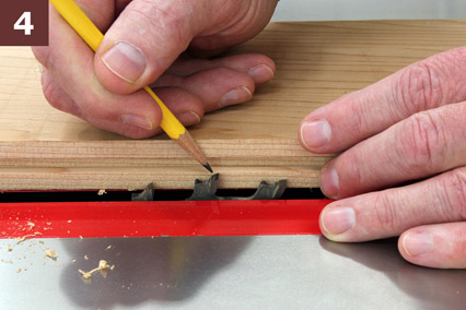 STEP 4: Now, let’s set up the tongue cut in the mating workpiece. Since we ran the first workpiece through twice, that groove is probably just a hair larger than 1/4″. No problem, just move the fence away and lay the first workpiece down against the blade as in Photo 4. Unlock and adjust the blade height, if needed, so the high point of a tooth comes just to the edge of that groove and lock it again. Whatever you do, don’t raise the blade too high, or you’ll have a tongue that’s too narrow. If you’re unsure, err on the low side; if the resulting tongue is too thick, you can always make it thinner.