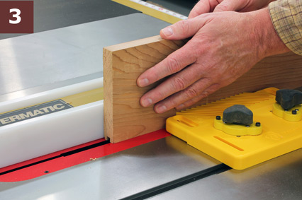 Step 3: Turn on the saw and run the workpiece through to create the groove. In Photo 3, I’m using a magnetic featherboard to keep the workpiece firmly against the rip fence. Now, let’s fine-tune that groove to center it exactly. With the fence and featherboard still in place, flip the board around with the opposite face against the fence and run it through a second time. The twin passes create a groove that is perfectly centered.