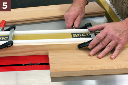 STEP 5: To set up for the cut, once again we won’t bother to measure. Instead, install a sacrificial face to the side of your rip fence. Note in Photo 5 that I’ve placed the workpiece against the fence to accurately set the clamps. With the sacrificial face attached, slide the rip fence over till it just kisses the blade. Not tight, not loose — you just want the wood of the sacrificial face to barely make contact, and then lock it down. That 1/4″ blade will cut a tongue exactly 1/4″ high, matching the depth of the groove cut earlier.
