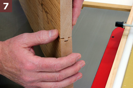 STEP 7: Check the fit of the resulting joint by slipping one workpiece into the other, as in Photo 7. If you erred on the low side and the tongue won’t go in, raise the blade slightly and repeat both cuts. Take care to adjust the blade only a hair at a time; it’s easy to go too far and end up with a tongue that doesn’t fit firmly into the groove.