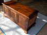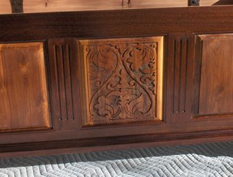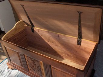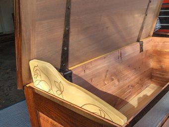 I started to build this for my daughter’s graduation from high school, but actually finished it in time for her graduation from her Masters’ program at college. Not having a dedicated shop and tools set up all the time made it difficult to get a lot done in a couple of hours on weekends when I could work on it. But after 5 years of sporadic work, the project of a lifetime is finally done. I used the Eastern Shore Chest plans from Rockler for a general design but used Tommy Mac’s blanket chest design for the center panel. And then I added the cedar inside and the engraving on the lid support to personalize it a little. I found a “hinge guy” to custom craft the hinges – Iron Leaf Forge in Kentucky. The rails, stiles and lid are made of Peruvian Walnut and the panels and feet are American Walnut finished with Waterlox Satin Finish.