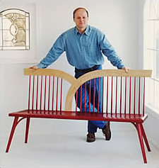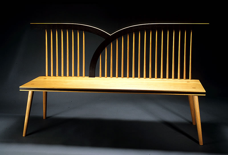 “Brush stroke bench, which also shows Asian influence, is a part of a series of benches I made that also combine styles. The first one is a traditional deacon’s bench with turned legs, hand riven spindles, and a back that mimics the curves used in Japanese brush stroke painting. Others followed, including one done in walnut that I made for my wife for our anniversary.”