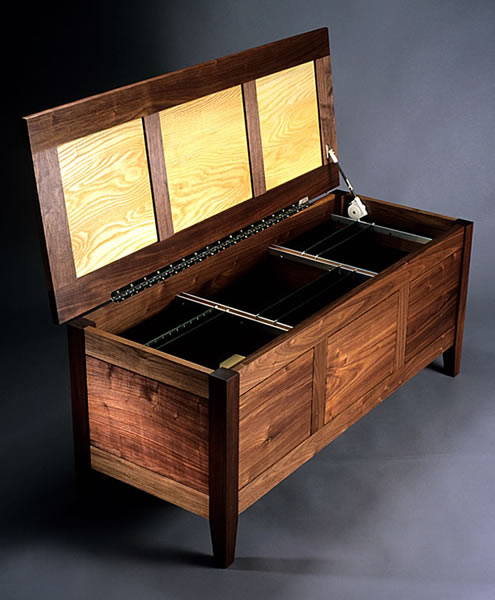 “Often I will combine Shaker and Asian,” Dennis explained, “to get a classic contemporary look. My contemporary Shaker cupboard is a good example of that, mixing dramatic wood choices with simple lines. Another is a room I did with a traditional coffered ceiling, using two contrasting color woods to make something very traditional in structure look quite modern. That’s the same reason I often use contrasting woods in my furniture. Using two different woods adds a contemporary feel to something comfortably traditional.