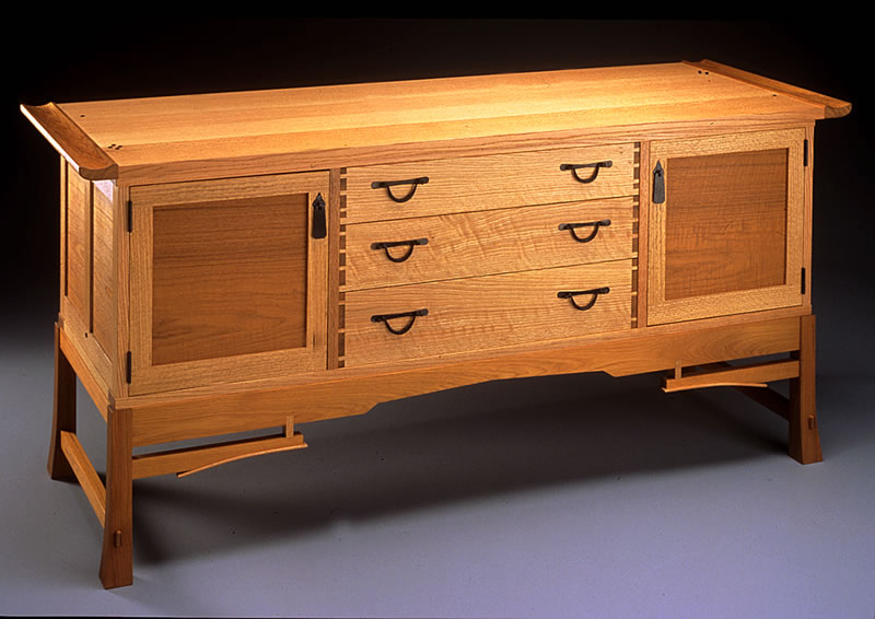 “The Hirukan cabinet and Hirukan credenza display a good example of yet another element I like to add. Hirukan (pronounced ‘here you con’) is a Japanese word indicating a curved or worm-like configuration. I try to incorporate at least one curved element on each piece. In the cabinet it shows up as a curved bead, but that same curve can show up in different places. On one table, one of the four legs mimics a plant stem with a curved offshoot coming off the bottom. Other pieces, like a table called Many Voices, incorporate the curves into the basic elements of the piece, such as legs, backs, tops and aprons.