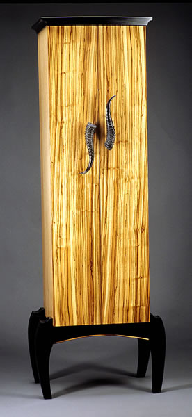 One of the more recent style influences on his work is Africa. “Serengeti is one of my newer pieces,” he explained, “and one that went over very well when we exhibited it at shows. I’ve been interested in going on safari, and though I’ve never been, I decided to design some pieces using African woods. The handles on the Serengeti cabinet are real African springbok horns. Those influences also show up on the Okai table and on a hall table made of zebrawood, oak and ebony which also sports an antelope horn drawer pull.
