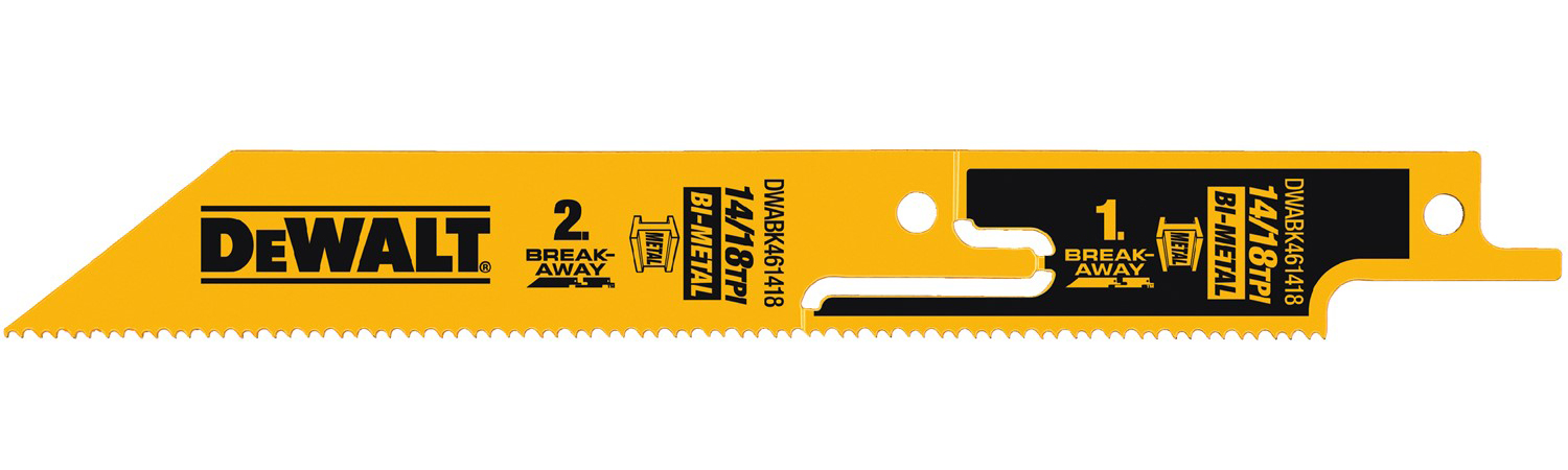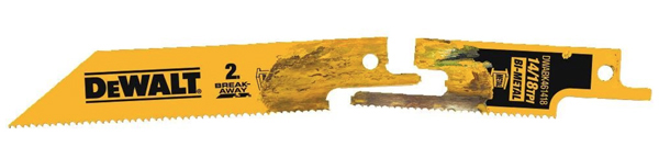 The 6-in. Breakaway Blade breaks into a 4-in. blade, which allows up to 1-in.-thick material to be cut. The 9-in. version breaks off into a 6-in. blade, which allows up to 2-in. material to be cut. Both blade sizes have a thick bi-metal body for durability: DeWALT reports them to have a 20 percent thicker kerf than its standard reciprocating saw blades. They feature a 14/18 variable tooth-pattern for optimized cuts in a variety of metal-cutting applications.