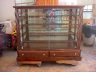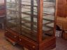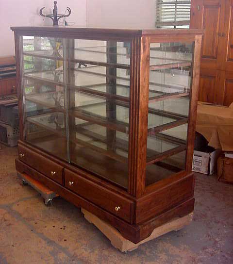 It is 5′ 3″ wide, 25″ deep, and 4′ 5″ high. It is out of walnut. The top is glass, as are the sides, and shelves. It has large sliding glass doors next to the fluted sides in the front. The bottom has two large drawers, dovetailed in poplar and faced off with walnut. The feet is a solid section of 1 1/2″ thick walnut, a continuous piece with the case mounted on them. Finished out in tung oil.