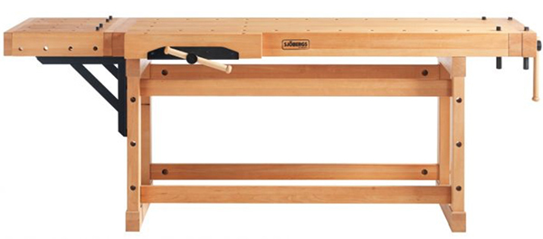 Weighing in at 329 lbs., the bench is both heavier and smarter than most other workbenches on the market. Its trestle base and top are constructed entirely of European beech: the 3-3/8-in.-thick top is made of full-length, knot-free laminations that are tongue-and-groove joined, with a 4-1/4-in.-wide skirt for maximum strength. The benchtop is 23-5/8 in. wide, and its working height is 35-7/16 in.