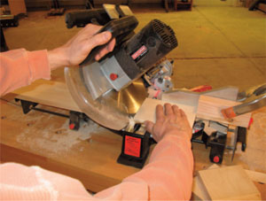 Start out by selecting your lumber and ripping enough material to make the top and bottom and the ends. (All of the dimensions for the various parts are found in the Cutting List (found at end of article) When that is done, step to your chop saw and set up the cut to form the miters on the ends of the pieces. See Figure 1. It is always a good idea to test the miter setup using scrap lumber first – despite being simple in concept, miters can be tricky to form accurately in practice. When the miters are a true 45 degrees, make the parts.