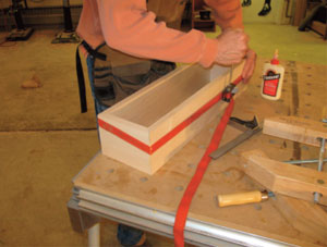 With the miters cut on the main pieces, go ahead and glue up the box subassembly of the unit. A band clamp is a great advantage when gluing up a mitered box. See Figure 2. You can add additional clamps after the band clamp has been cinched up tight. Test the glue-up to be certain that it is square and true, then set it aside and allow the glue to cure.