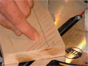 Forming the rail is the next task. Once you rip it to size and chop it to length, lay out its basic shape using a sliding combination square. The center chevron is 3-3/4″ wide at its narrow point. The step up is 1″ and the miters at the ends are 2″ across. Feel free to adjust the shape to please you. The laser on the Craftsman chop saw used here helped to accurately align and cut the miters on the ends of the rail. See Figure 3.