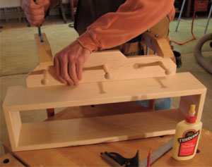 Glue the Shaker pegs into the holes in the rail and then glue and clamp the rail to the box subassembly. Try to minimize the glue squeeze-out on the front edge of the rail. Clean off any squeeze-out before it gets too hard. See Figure 6.