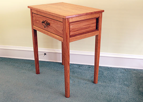 “I made this 16-3/4″ X 24″ X 29-1/2″ end table from wood harvested from various jobsites over several years. The top is wavy grain red oak. The drawer face and side panels are black locust. The side trim and drawer sides are black walnut. The legs and rails are quartersawn white and red oak. The brass drawer pull is from my grandfather’s Victorian chest.” – Eric C. Leissa