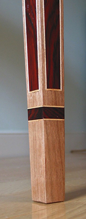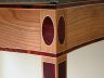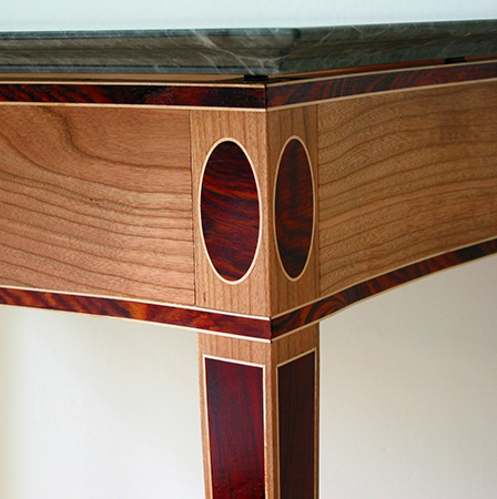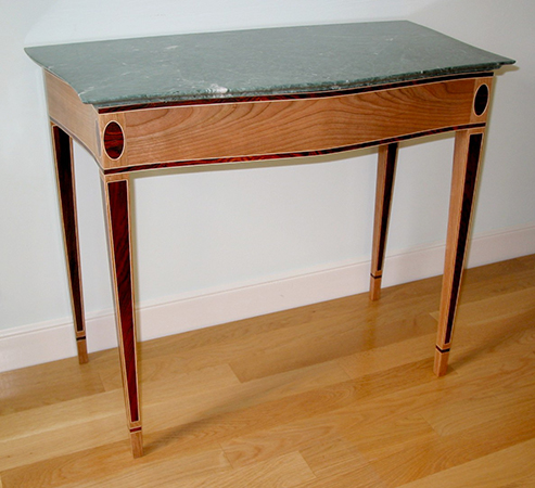 I made this Federal serpentine table in a class at the Furniture Institute of Massachusetts. The primary wood is cherry with cocobolo inlays and holly stringing. Since the shellac caused the cocobolo to bleed, I ended up using Hydrocote water-based lacquer for the finish. The top is marble.