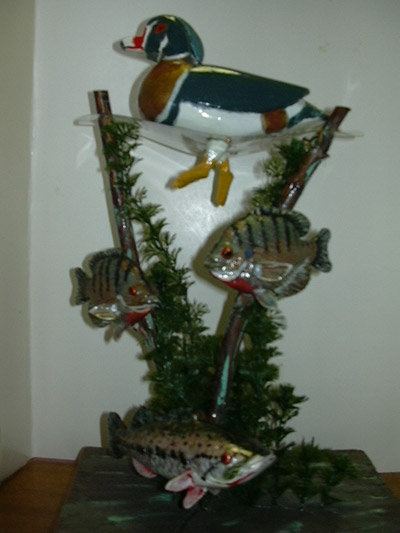 The duck and the fish are hand carved from recycled wood. I enjoy carving and only use recycled wood. I have many more carvings.