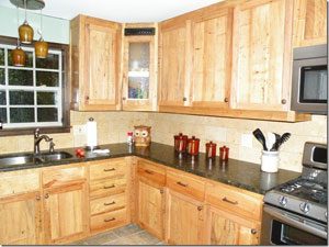“This is an interesting kitchen. Other than the door we are talking about, kitchen is made of spalted real pecan. Behind the doors we have been talking about is wire shelving on 500-pound rollers. They pull out as the pantries, one on each side of the fridge. I didn’t waste the depth of the refrigerator. Drawers are made with dovetailed sycamore.” – Lyle Pellisier