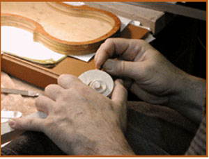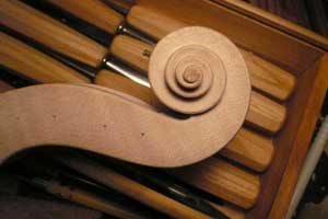 Some of the specialized tools include finger or thumb planes for shaping a violin’s arch; sets of 9 or 10 short, graduated gouges for creating the end of a scroll; long, tapered knives for cutting “F” holes in the top of a violin; and special sets of reamers, with a standard taper of 1 to 30, plus shapers made to the same taper, to fit the tuning pegs.