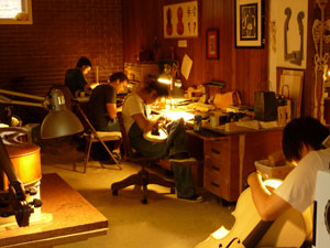 In addition to building the instruments by hand, the students apply the finish by hand: 20 to 30 coats of a spirit-based varnish they make themselves. The school usually buys its wood from specialized instrumentdealers — and then stores it for several years. “Most makers want their wood to be air dried for 10 years,” Fred said. “We usually buy wood at three to five years old and then let it dry here” — in order to save on costs associated with paying for storage space.