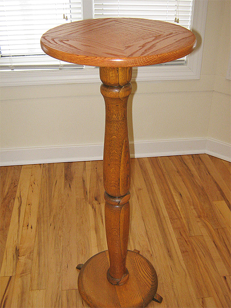 “In regard to end grain, I think hiding end grain is still valid and project-dependent. I recently had a dilemma repairing an antique pedestal plant stand (see photo above). It was originally handmade for my aunt by a local craftsman, probably in the 1940s or 50s. It is made of oak, except for the round top that had been replaced with a piece of plywood covered with a wood grain contact paper! I’m sure the original top was a parallel glue-up and cut into a circle, similar to the base. However, I decided to make the blank from four triangular pieces glued up so that the edge grain would predominantly be in the joint, leaving mostly edge grain around the outside (probably there is a name for doing this that would have saved a lengthy description).” – Bill Koski