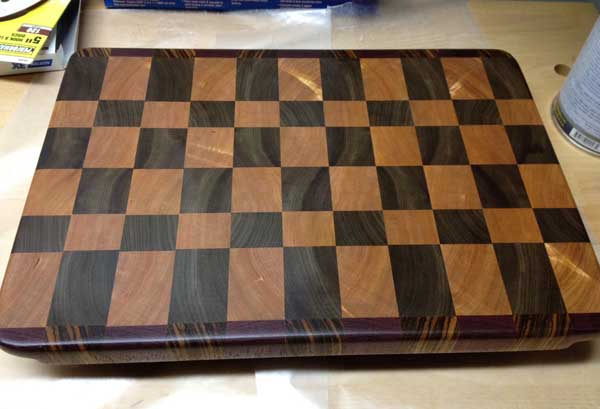 This was my first holiday season as a woodworker, but once I got the idea to make one gift, it quickly spiraled out of control and before I knew it, I was even making gifts for people I hadn’t seen or spoken to in months. In addition to numerous turned pens and bottle openers, I completed not one but five butcher-block cutting boards (technically six if you count the one I cut in half). The cutting board pictured is the one I gave to my wife – the majority of the board is walnut and cherry, with the edges done in purpleheart and zebrawood. – Matt Becker, Internet Production Coordinator