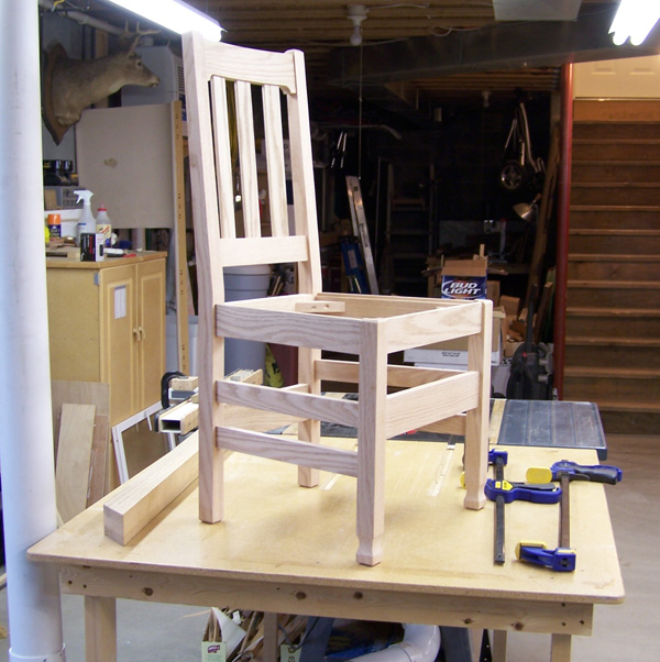 All the joints in my set of chairs are mortise and tenon joinery as opposed to the dowel pin joinery used in the chair int he article.  I just felt that although this is more time consuming it makes a stronger joint. Also the curved backs are bent laminates inplace of cutting them from thicker stock. Each section of the curved back is made up of 5 pieces of red oak. The chairs are red oak finished in early american stain with a wipe on satin finish.