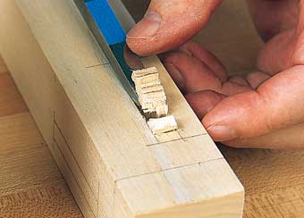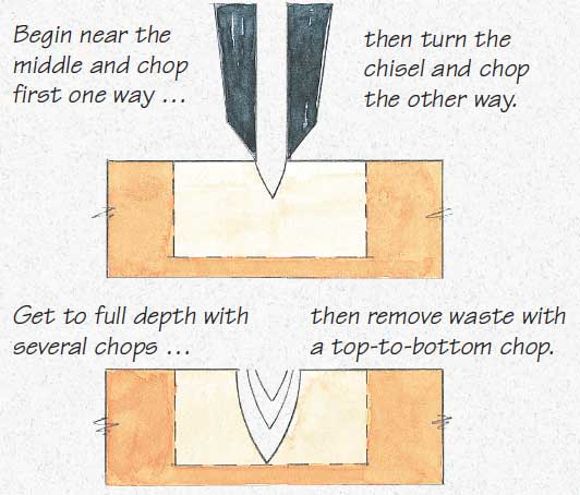 There are two ways to chop out the mortise. I call them the layered method and the full-depth method (see sidebar, below). Using the layered method, you remove the waste in layers by cutting the mortise end-to-end at half the depth, then removing a second layer to the full depth.