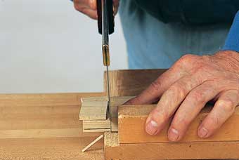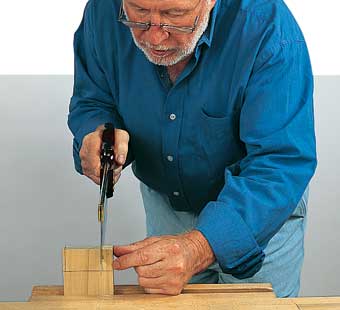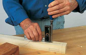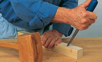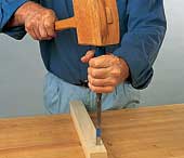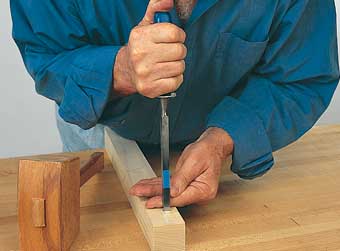 Chop with a joiner’s mallet. A cylindrical carver’s mallet is not designed to deliver the heavy blows required for chopping mortises. Plus, a glancing blow off the chisel handle could hurt your wrist. Also avoid a dead blow hammer. Because it deadens the chisel’s response to the hammer blow, you won’t know when the chisel has been driven solid and can’t be driven further.