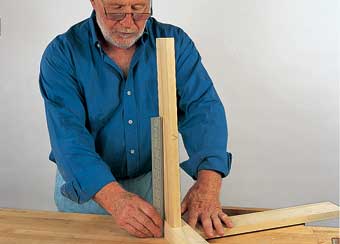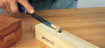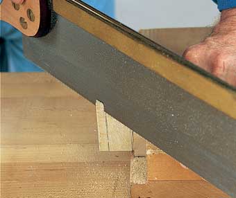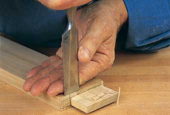 You need a bench hook to rest the work in while you saw the shoulders. Saw about 1/16″ from the shoulder line. Clean up the shoulder and cut it square by vertical paring with a wide bevel-edge chisel. Check the shoulders with a try square.