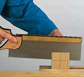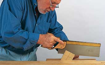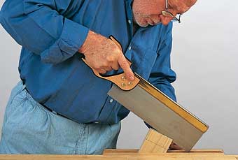 A tenon saw, also called a bench saw, is a robust tool designed for general cutting. Don’t cut tenons with a dovetail saw: The blade is too thin and the saw will wander. Four keys to accurate sawing are grip; alignment of wrist, arm and shoulder; motion; and stance. Note that four fingers wrap around the handle, but the extended index finger presses against the side of the handle, and points down the saw. This grip provides more steering control. Align the wrist, lower and upper arm, and shoulder in one plane so that you can saw back and forth in a straight line, like a piston. Stand balanced on two feet and far enough from the workpiece so that you can maintain the piston-like alignment and motion. Put your spare hand lightly on the work — don’t lean on it for balance.